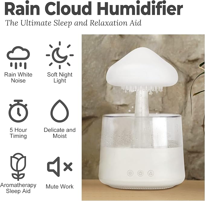 Efekt deszczu z dźwiękiem – urządzenie symuluje delikatny opad deszczu, a naturalny odgłos spadających kropel sprzyja wyciszeniu i redukcji stresu. Dzięki temu LumiShroom działa nie tylko jako nawilżacz, ale również jako naturalny sposób na relaks i poprawę nastroju.